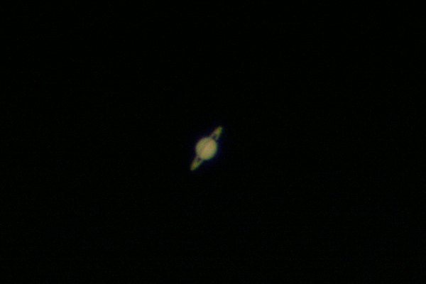 Ich nehme mir abseits des Kurses - Anneliese referiert heute - Zeit, um mit der direkt angeschlossenen Canon EOS 350D aufzunehmen. Trotz dichter Cirren sehr scharf und gar nicht so blau am Rand. Jetzt ist Übersiedeln angesagt, mit dem Refraktor ums Eck, um nach dem Kurs Saturn zu beobachten. Abbau, Transport, Aufbau, das geht mit diesem Rohr in einer Viertelstunde. Das Bild des Saturn ist gestochen scharf und bis zum 7mm Pentax-Okular ein Genuss (kürzere Brennweite habe ich gar nicht). Auch das Stativ hält relativ gut, ich habe die Ablageplatte verschraubt, das hält das Gewackle in Grenzen. Jetzt riskiere auch ich einen Schnappschuss durchs Okular.