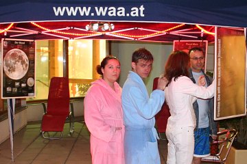 Zum zweiten Mal gastieren wir mit der Mobilen Volkssternwarte beim Vollmondbaden in der Therme Wien Oberlaa (Premiere war am 21. Februar, hier der Bericht). Heute ist alles schon Routine, Aufbau und Installation sind bald erledigt. Neu ist, jahres- und sommerzeitbedingt, dass es zu Beginn noch hell ist, so dass unsere erste Präsentation um 19 Uhr der Sonne gilt.
