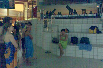 Endlich ist es so weit, es ist dunkel genug, um Saturn zu sehen. Der milde Abend macht es den Badegästen leicht, die Halle kurz für einen Blick durchs Teleskop zu verlassen. Und um 20.30 Uhr wird die Live-Show in die Halle übertragen.