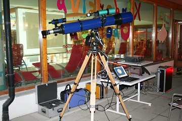 Die Cirren, die den Abendhimmel schmücken, lösen sich bald auf und so beginnt das Warten auf die Dämmerung und den Planeten Saturn, der unser nächstes Ziel sein wird. Per Webcam soll sein Bild wieder in die Schwimmhalle übertragen werden, während Rolands 18" Dobson zum Durchschauen einlädt. Die Webcam bedient heute der 6" Skywatcher Refraktor. Er ist einfach transportabler und für den Zweck mehr als ausreichend. Rolands Berlebach-Stativ verleiht ihm die nötige Stabilität.