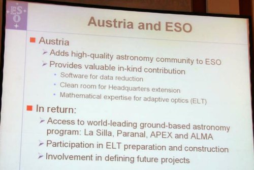 In seiner Ansprache hob ESO-Generaldirektor Tim de Zeeuw nicht nur die Vorteile der ESO für Österreichs Astronomie hervor, sondern auch, in welcher Weise sich das neue Mitglied Österreich in die ESO einbringen wird; hervorgehoben wurde vor allem die Expertise heimischer Mathematiker, die eine entscheidende Rolle in der Entwicklung der adaptiven Optik für das neue Extremely Large Telescope spielen wird.