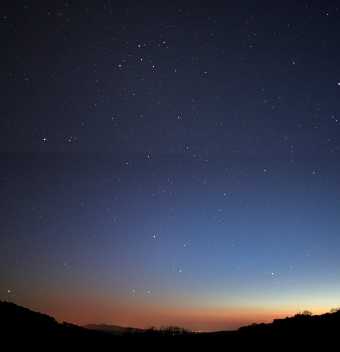 Abschied vom Winterhimmel. Orion geht in der Dämmerung unter, bald folgt Sirius. Interessant: Die "Drillinge", Mars steht ganz