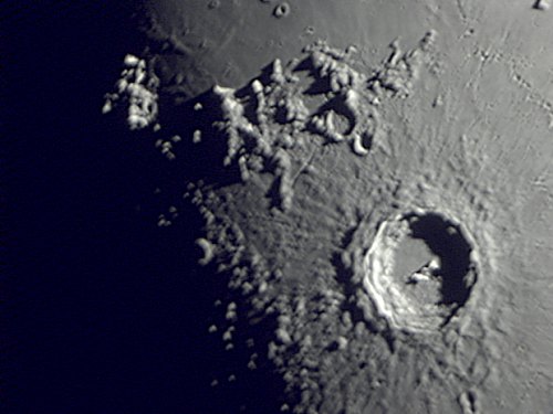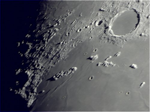 Plato, Copernicus, Tycho und Clavius sind bei diesem Mondalter die lohnendsten Ziele (wobei Tycho selbst bei stärkerer Vergrößerung nicht viel hergibt) und ich widme mich ihnen mit der Webcam (alle nachfolgenden Aufnahmen am 12" LX-200 bei f/10, F=3m, Philips SPC 900NC, IR Passfilter 742nm, verkleinert).