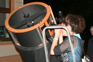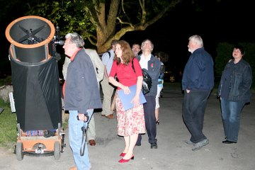 Roland hat seinen 18" Obsession auf dem Weg direkt vor dem Springerschlössl aufgebaut. Um Punkt 22 Uhr, als wir den Abend gerade beenden wollen, dann die grosse Schrecksekunde: Mitten unter den am Wegrand liegenden geöffneten Ausrüstungskoffern aktiviert sich automatisch ein Rasensprenger! Rasch greifen alle, was zu greifen ist, und bringen es in Sicherheit. Zum Glück ist es so warm, dass diese unfreiwillige nächtliche Dusche nichts ausmacht - auch nicht der Ausrüstung. Sage noch einmal jemand, Astronomie ist nicht aufregend! |