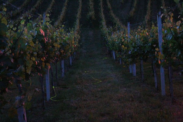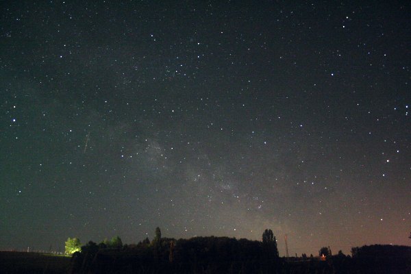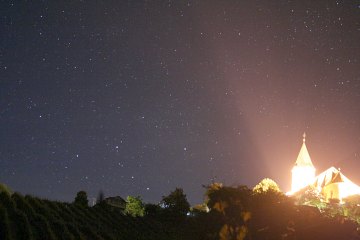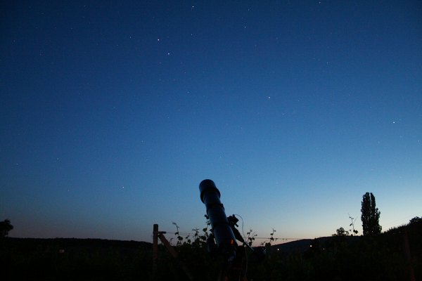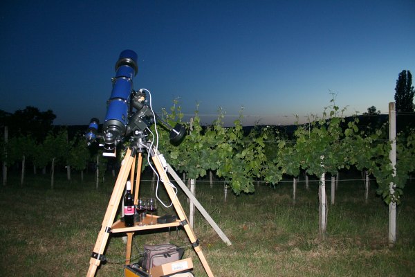 Ich habe den 6" Skywatcher-Refraktor der WAA in die Steiermark "entführt"; das Instrument erschien mir angesichts der nicht so ganz sicheren Wetterprognosen ein (im wahrsten Sinn des Wortes) tragbarer Kompromiss gegenüber meinem überschweren 12" LX-200. Im Weingarten hinter der Buschenschank gibt es einen nahe gelegenen, ganz brauchbaren Platz zum Beobachten. Nicht ganz ohne Lichtverschmutzung, aber nahe genug, die Ausrüstung vom Parkplatz hinzutragen. Das gibt eine stilvolle Beobachtung.