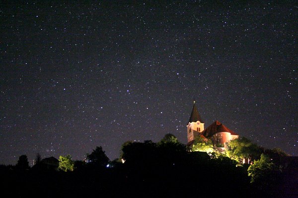 Auf das Foto von den Glühwürmchen bin ich mehr stolz als auf so manches Astrofoto! In der kleinen Gemeinde St. Anna am Aigen ist an diesem letzten Maiabend, der von der Temperatur eher ein Sommerabend ist, eine Menge los. Auf dem Kirchplatz führt die örtliche Theatergruppe Hoffmannsthals Jedermann auf (kein Scherz) und auf dem nahen Sportplatz feiert der örtliche Fussballklub den Meistertitel in einer wohl nicht so bedeutenden Liga. Beides sorgt zunächst für zuviel Licht.