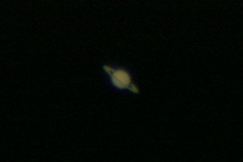 Doch jetzt zum Sternenhimmel. Es ist in der Tat eine tolle Nacht, die Durchsicht wird nur ein wenig durch bodennahen Dunst gemindert. Doch für ein schönes Himmelserlebnis reicht es allemal. Das beginnt mit Saturn, der bei mittelprächtigem Seeing dennoch ein wunderschöner Anblick ist, vor allem im Umfeld seiner Monde. Ich halte den Planeten mit einem Schnappschuss durchs Okular fest (Computer und Webcam sind zuhause geblieben, schön, einmal "nur" mit einem Fernrohr unterwegs zu sein).