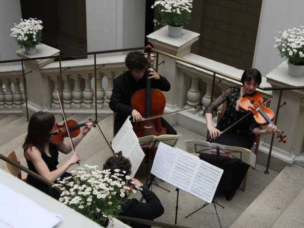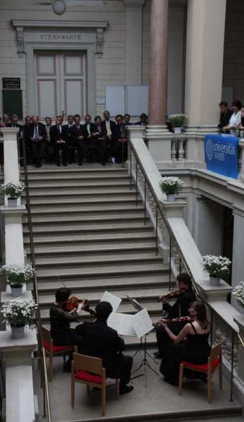 Ein weiteres Musikstück des sehr guten Streichquartetts auf der akustisch überraschend guten Feststiege beendete den formalen Teil der Feier. Zwei Vorträge im Hörsaal rundeten das Programm ab.