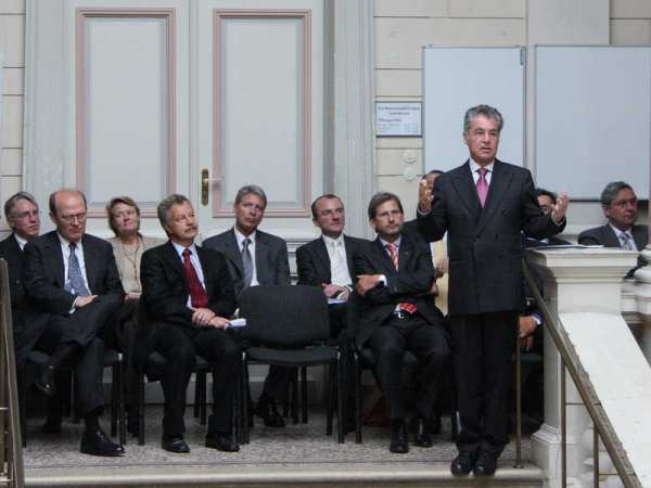 Durch die musikuntermalte Feier führte Institutsvorstand Univ.-Prof. Hensler. Zur Eröffnung sprachen Bezirksvorsteher Homole, Vizerektor Univ.-Prof. Engl und der Vorsitzende des Universitätsrates Mag. Kothbauer.