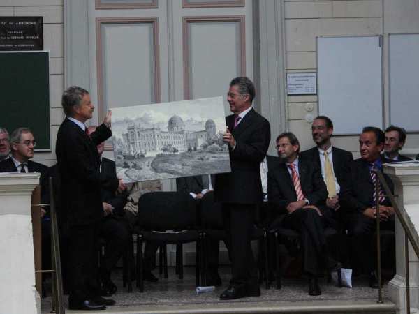 Schließlich erzählte Bundespräsident Dr. Fischer von seiner jugendlichen Begeisterung für Physik und auch Astronomie, die er seinem Physiklehrer an seiner Schule [auch mein BG13, Fichtnergasse] und einem älteren Mitschüler, einem gewissen Hermann Mucke [anwesend, aber unbegrüßt!], verdankte, und die ihn fast zum Studium der Physik bewogen hatte. Er erinnerte auch an das Astronomiebuch von Prof. Thomas, das "kaum noch jemand kennen dürfte". Zum Abschied wurde ihm von Prof. Hensler eine Reproduktion eines Stiches von J.J.Kirchner überreicht, das die damals neue Sternwarte auf einem fast waldfreien Hügel mit wenigen jungen Bäumen zeigt.