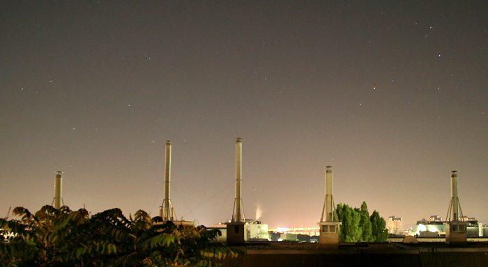Mondlicht und Dunst machen weitere Beobachtungen zunächst sinnlos. Um Mitternacht dann ein Panormaschuss zu den südlichen Sternbildern Skorpion und Schütze. Man erkennt im hellen Licht der Südautobahn und der SCS sogar den Stachel des Skorpions!