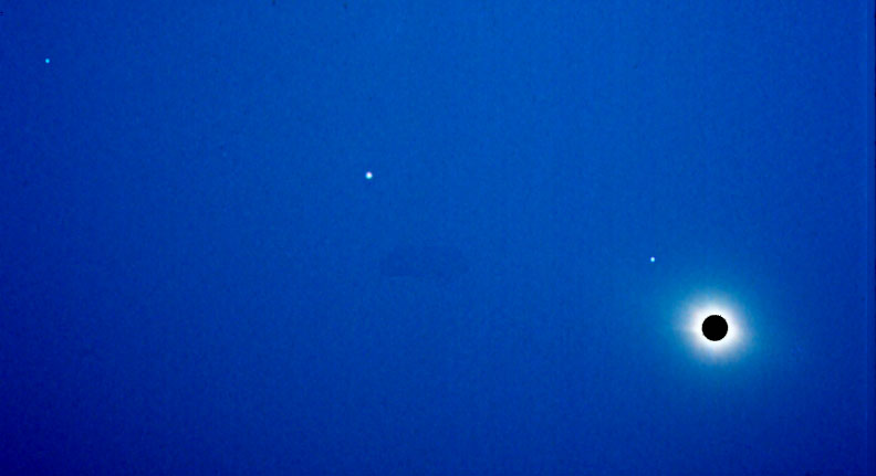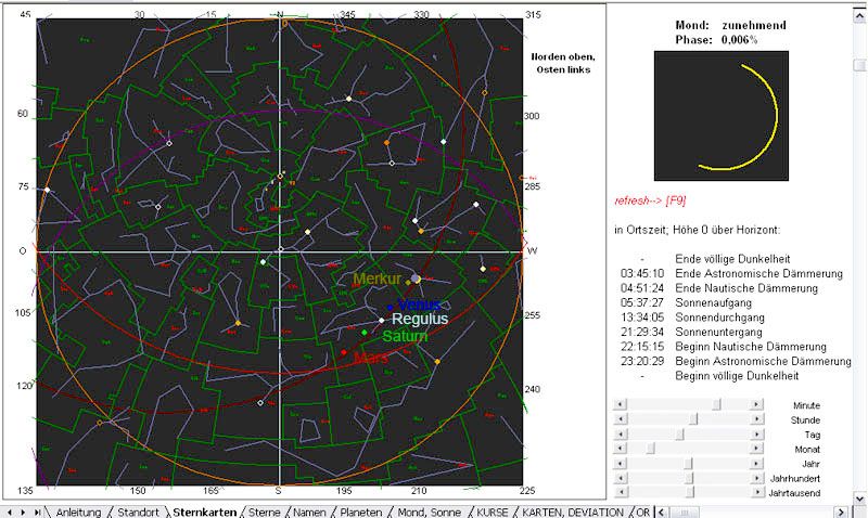 Bei totalen Sonnenfinsternissen werden Sonnen-nahe Gestirne sichtbar, die normalerweise am Taghimmel von der Sonne überstrahlt werden und somit unsichtbar bleiben. Eine Sternkarte für die Beobachtungszeit und die o.g. Orts-Koordinaten zeigt die fünf während der Totalität beobachteten Gestirne Merkur, Venus, Regulus, Saturn und Mars, aufgereiht an der Ekliptik wie an einer Perlenschnur. Die Sternkarte ist Teil meines selbst geschriebenen Programms „Astro-Navigation mit Excel“. Ebenso habe ich die Werte für die Berechnungen weiter unten aus diesem Programm entnommen. Die schwächeren Sterne habe ich dabei abgeschalten, Skelett-Linien und Sternbildgrenzen zur besseren Orientierung eingeschalten. Die Dämmerungszeiten gelten für Datum und Ortszeit Novosibirsk.