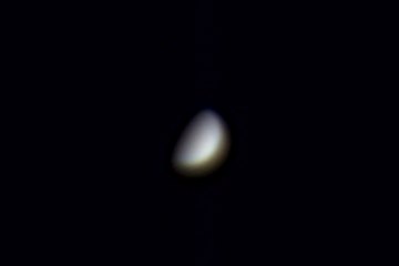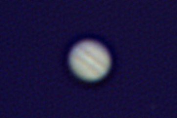 Schon ist Venus freisichtig zu erkennen und im Fernrohr zeigt sie eine deutliche Phase. Jupiter ist nur mehr sehr blaß und bei sehr mäßigem Seeing erkenne ich im Fernrohr kaum Details. Dennoch zücke ich die Webcam, um trotz des Seeings einen Größenvergleich von Venus und Jupiter zu machen. Brennweite F=3000mm.