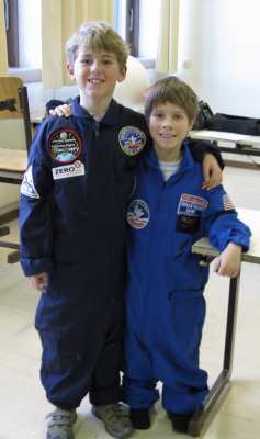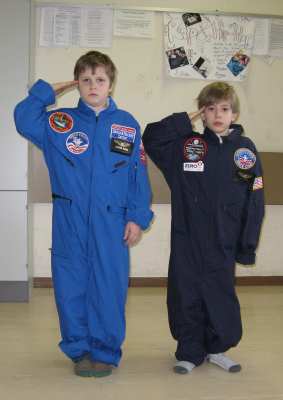 Nachdem wir uns in einem kurzen Video den Start eines Space Shuttles angesehen hatten, konnten die Kinder selbst in die Rollen von Astronauten und Mitarbeitern der Bodenstation schlüpfen. In einem Rollenspiel wurde der Dialog zwischen Bodenstation und Astronauten während eines Shuttlestarts nachgespielt. Für den Commander und den Piloten hatten wir sogar echte NASA Anzüge (von meinem Aufenthalt im Space Camp 2006) mitgebracht.