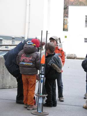 Der zweite Nachmittag war dann mehr den Planeten und astronomischen Fragen gewidment. Während eine Gruppe versuchte, in einem Versuch die Erforschung eines Planeten durch Radar nachzuvollziehen, konnte die andere Gruppe Fragen stellen. Es stellte sich wieder heraus, dass Kinder genau die Fragen stellen, die auch uns Erwachsene an der Astronomie faszinieren: Was war vor dem Urknall? Was ist außerhalb des Universums? Das Highlight beider Nachmittage waren aber Rolands verschiedene Raketenstarts. Die ersten Raketen flogen mit Luftantrieb, dann wurde eine Wasserrakete gestartet - man könnte sagen, mit durchschlagendem Erfolg. Die Nachbarin war "not amused", als plötzlich in hohem Bogen eine Rakete und kurz danach das Rettungskommando über den Gartenzaun kam. Wir entschuldigen uns nochmals. Aber diese Rakete wird wohl allen in Erinnerung bleiben! Am zweiten Nachmittag wurde dann noch ein weiterer Antrieb ausprobiert - die Brausetablettenrakete. Es ist erstaunlich, wie weit eine kleine Rakete mit einem halben Aspirin C als Treibstoff fliegen kann.