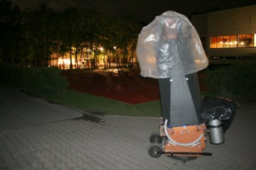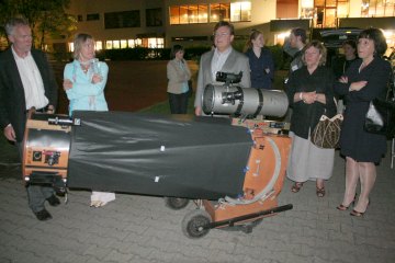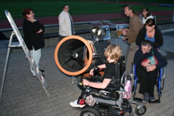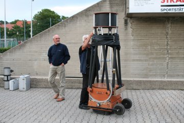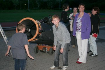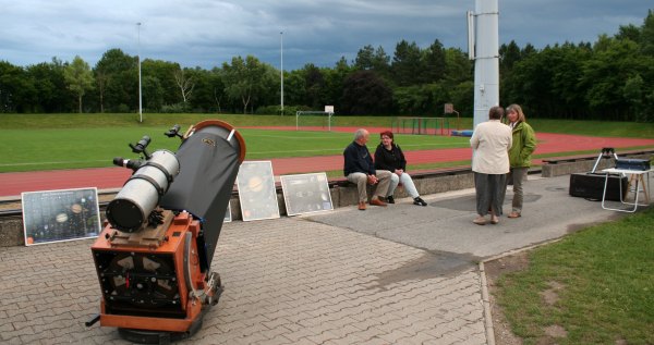 Dank festem Dach über dem Kopf funktioniert das Kulturprogramm reibungslos. Dann kommt die erste Pause. Himmelsobjekte können wir leider keine zeigen. Dennoch interessieren sich viele für das merkwürdige Gerät am Rand des Sportplatzes.