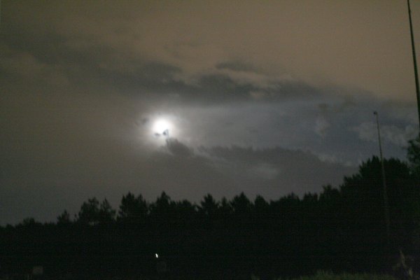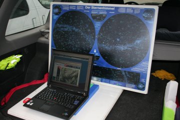 Sehr schade. Es beginnt während des dritten Teils des Konzerts stärker zu regnen. Wir retten den Dobson unter das Vordach des Sportzentrums und bauen ihn ab. Als der letzte Teil in Rolands Auto verstaut ist, geben die Wolken den Mond frei. Eine Handbewegung meinerseits in Richtung Mond wird hier nicht näher beschrieben ...