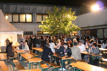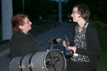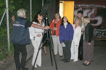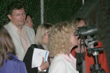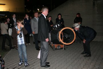 Gegen 18 Uhr sage ich angesichts dunkler Wolken und Regen dann doch den Sternabend auf dem Kahlenberg ab. Den Veranstalter in Strebersdorf informieren wir, dass die Himmelsbeobachtung heute wohl ausfallen würde, wir (das Team Monika Klapka, Stefi Scharlach, Roland Graf und ich) fahren nach Strebersdorf. In all der Hektik hatte ich aber vergessen, unser Team aus dem ferneren Süden (Christine und Kurt Bretschneider) abzubestellen, und so treffen wir in grösserer Besetzung in Strebersdorf ein als letztendlich geplant.