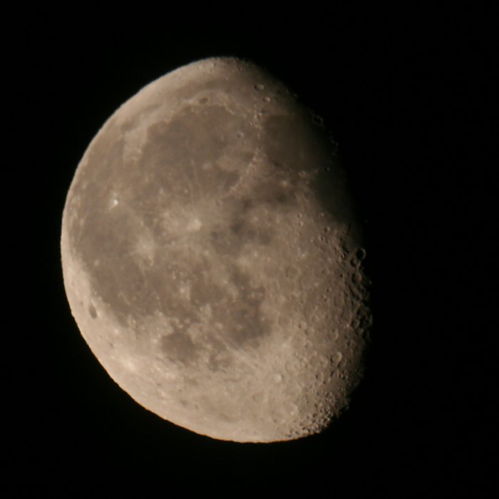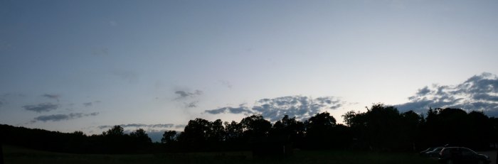 Die Wolken werden wieder dichter. Plötzlich recht grelles Wetterleuchten. Wir bauen recht zügig ab. Kaum ist alles verstaut, fallen einige Regentropfen. Auf der Heimfahrt dann zeitweise stärkerer Regen. Im Radio beschwert sich ein Hörer über den Wetterbericht, er sitzt im Regen auf seiner Grillparty. Zuhause angekommen strahlen Mond und Jupiter aus einem Wolkenloch. Rasch noch ein Mondfoto, um meine Phasenserie zu ergänzen.