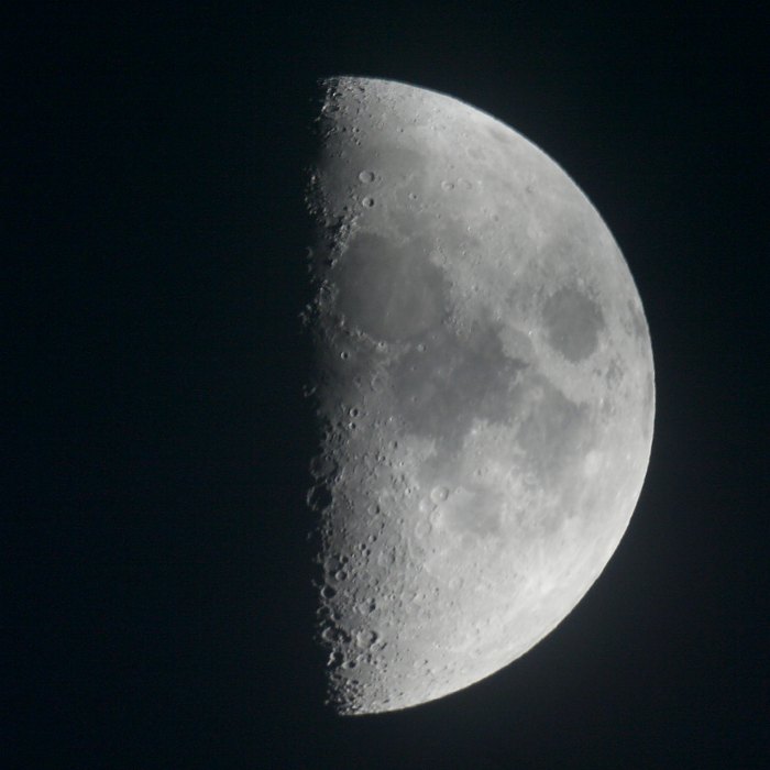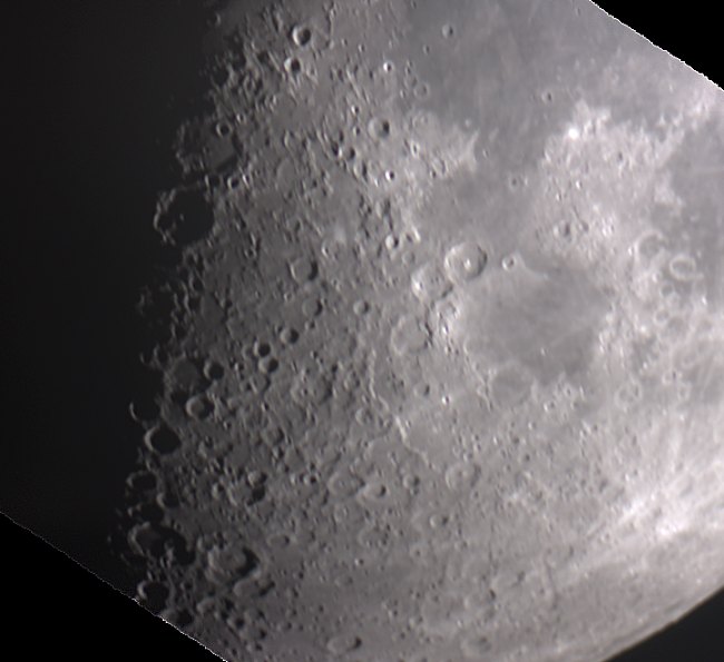 Auch ein erster, lang ersehnter Test der "Next Generation Webcam" mit dem unaussprechlichen Namen DBK 21AU04.AS - USB von Imaging Source ist drin. Sie hat nur 640x480 Pixel, ist aber extrem schnell bei einem beeindruckenden Belichtungsspektrum von 1/50.000s bis zu einer Stunde und bis 60 Bilder pro Sekunde (auf meinem Laptop nur 30 Bilder/Sekunde, das reicht aber). Da mir die Wetterlage zu unsicher für ein "echtes" Fernrohr ist, probiere ich die Kamera am stehenden Teleobjektiv F=1000mm aus. Während der Aufnahme zieht der Mond über den Chip, Registax 5 erledingt den Rest. Durch die teils dichte Bewölkung muss ich etwas zu lange belichten, so dass doch eine leichte Verzerrung da ist, aber sonst wieder eine neue Dimension der Mondfotografie - Kleine Details mit nicht nachgeführter Kamera.