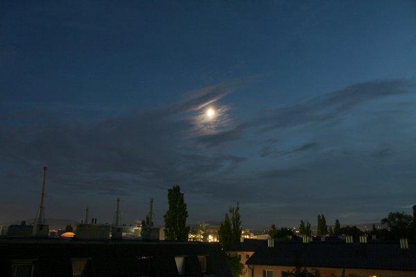 | Bericht: | Und da kommt es, das lang erhoffte Wolkenloch am Abend, und der Mond scheint durch. Klar ist anders, ein Mix von mittleren und hohen Wolken zieht immer mehr oder weniger schnell über den Mond.