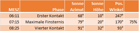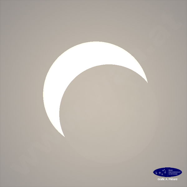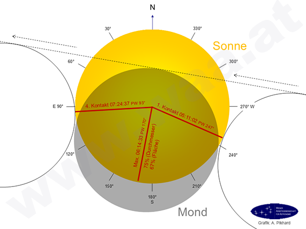 Die Finsternis in WienDie Finsternis ist in Wien in den Morgenstunden in vollem Verlauf zu sehen. Der Mond verfinstert die Sonne zu 75% bezogen auf den scheinbaren Durchmesser bzw. zu 67% bezogen auf die Fläche. Verdunkelung und Abkühlung sollten bei diesem Grad der Verfinsterung trotz der frühen Morgenstunde zu bemerken sein.