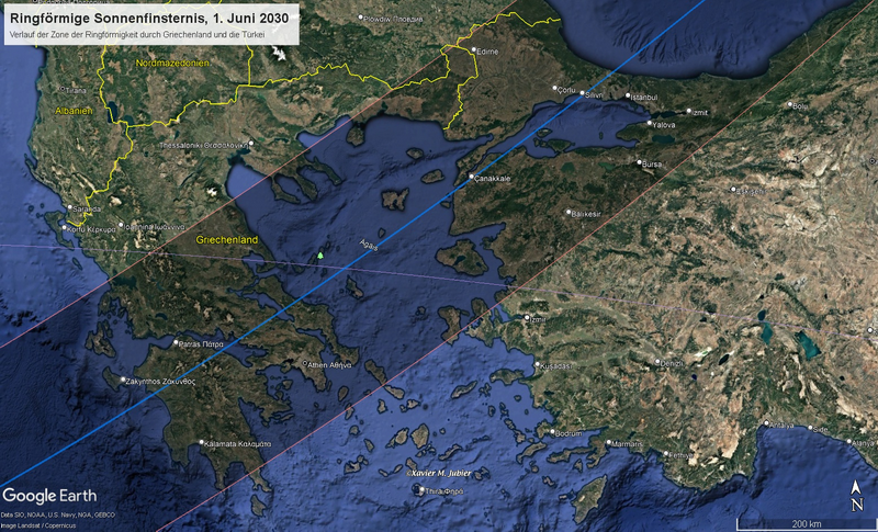 Dieser Artikel beschreibt eine Sonnenfinsternis. Bitte beachten Sie unbedingt unsere Sicherheitshinweise zur Beobachtung der Sonne, um Augenschäden bei der Beobachtung der Finsternis zu vermeiden! Von den beiden zentralen Sonnenfinsternissen im Jahr 2030 ist die erste, am 1. Juni, global ringförmig, bei uns partiell. Die Finsternis globalEs handelt sich um eine ringförmige Sonnenfinsternis. Das Sichtbarkeitsgebiet umfasst ganz Europa, fast ganz Asien und die nordöstlichen Teile Afrikas. Die Zone der Ringförmigkeit verläuft von Nordafrika über das Mittelmeer, durch Griechenland und den Bosporus, das Schwarze Meer, den Süden Russlands (mit einem kleinen Teil im Norden Chinas) in den Pazifik.
