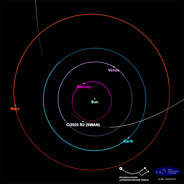 Komet SWAN umkreist die Sonne auf einer langperiodischen Bahn und erreichte am 12. September 2025 seinen sonnennächsten Punkt (Perihel) in einer Distanz von ca. 0,5 Astronomischen Einheiten von der Sonne, das ist etwas mehr als die Merkurdistanz. Die Bahn ist nur gering zur Ekliptik geneigt. Referenzen: