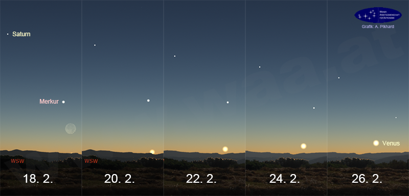 Ende Februar 2026 kommt es zu einer sehr lockeren Begegnung der drei Planeten Merkur, Venus und Saturn am Abendhimmel. Merkur und Saturn stehen dabei am Ende, Venus am Beginn einer Sichtbarkeitsperiode.